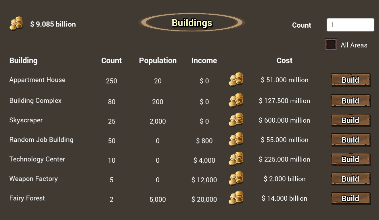- Cost Increase per building is doubled after the first 100 buildings. (example: +0.2 million per building starting from 100th Appartement House). The initial cost is added one more time for the 100th building too.